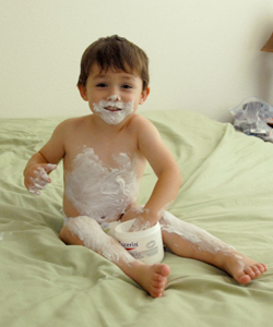 Now, Eucerin Cream is not like regular lotion. It's heavy and greasy and a major Pain in the Ass to rub in, wipe off or clean up in any fashion. I am surprised my youngest offspring has any skin remaining on his body. I plunked him in the tub immediately and proceeded to scrub him with grease fighting dish soap and a washcloth.